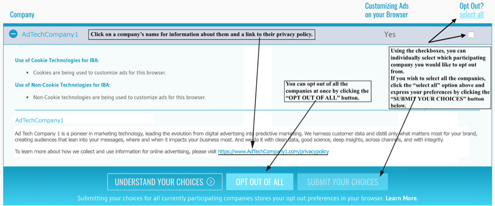 At this point, you may optionally click on an individual company participating in the tool to see (1) if they are currently customizing ads on your browser; (2) the availability of an opt-out of data collection for interest-based advertising purposes; (3) the use of either or both cookie and non-cookie technology to enable interest-based advertising tailored for your browser; (4) a short description of the company; and (5) the ability to click on and inspect the company’s privacy policy in a new tab.