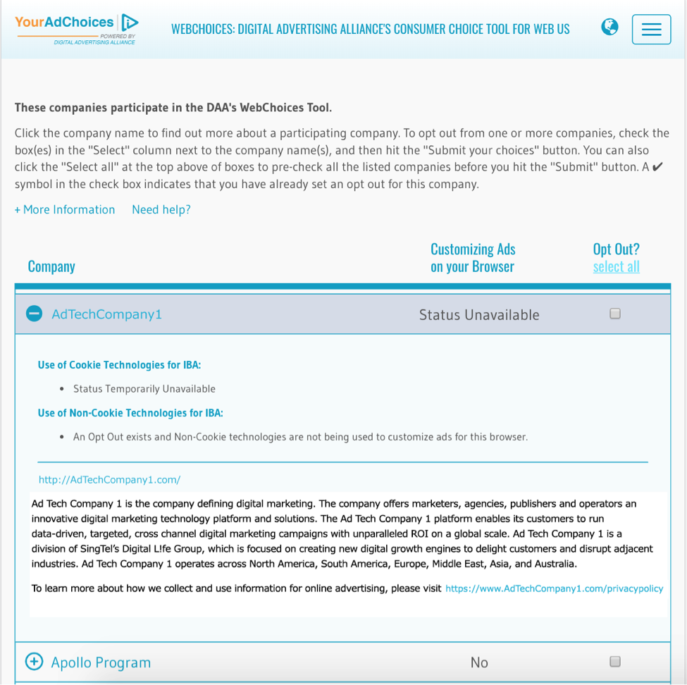 You can click on “More Information” for more information about interest-based advertising. You can also see the companies for which status information was not completed by reviewing the top of the company listing at the “Company” column. You can also see which opt-out requests were not completed on the WebChoices landing page, if any, by inspecting for unchecked boxes under the “Opt Out?” column.